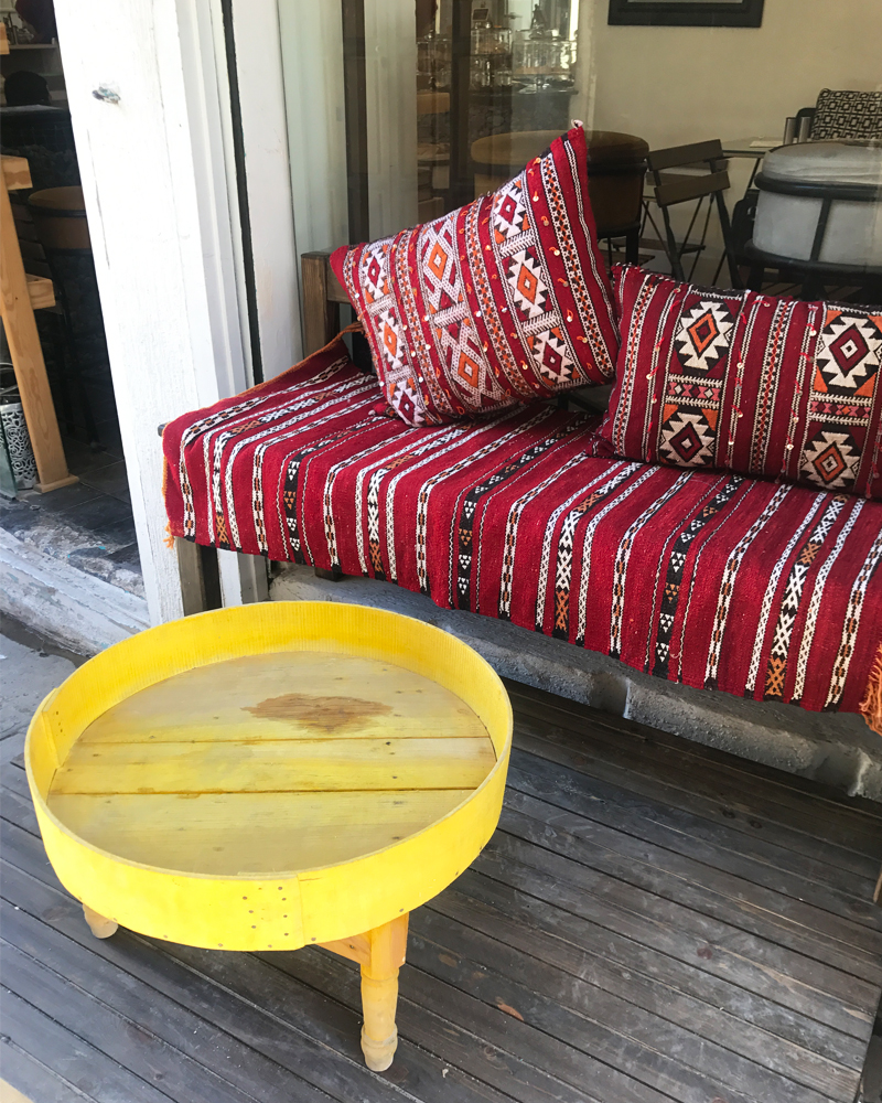 モロッコの伝統的なゼンモール柄の生地に、縁取りがあるティーテーブル
