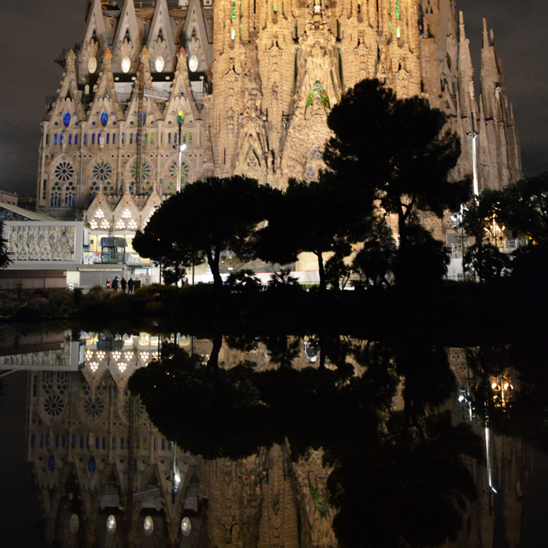 昼間訪れたガウディ広場の池へ行ってみると、なんと池の水面に反射したサグラダファミリアが実現!