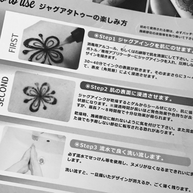 ジャグアタトゥーは、茶色くなるヘナタトゥーと違って黒や濃い紺色に染まるのが特徴です。