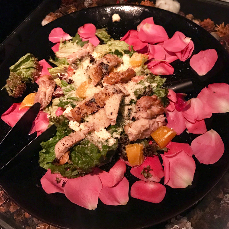 チキンやリコッタチーズも盛り付けしていき、完成したのがこちら。オレンジも入っていて、爽やかな味わい。