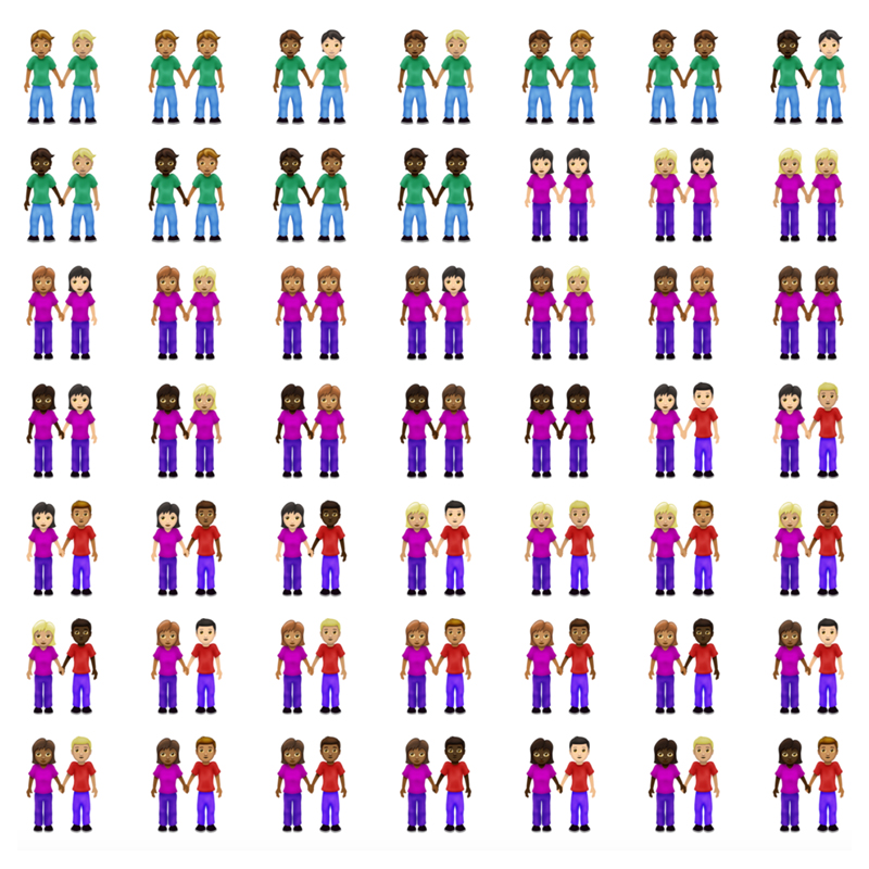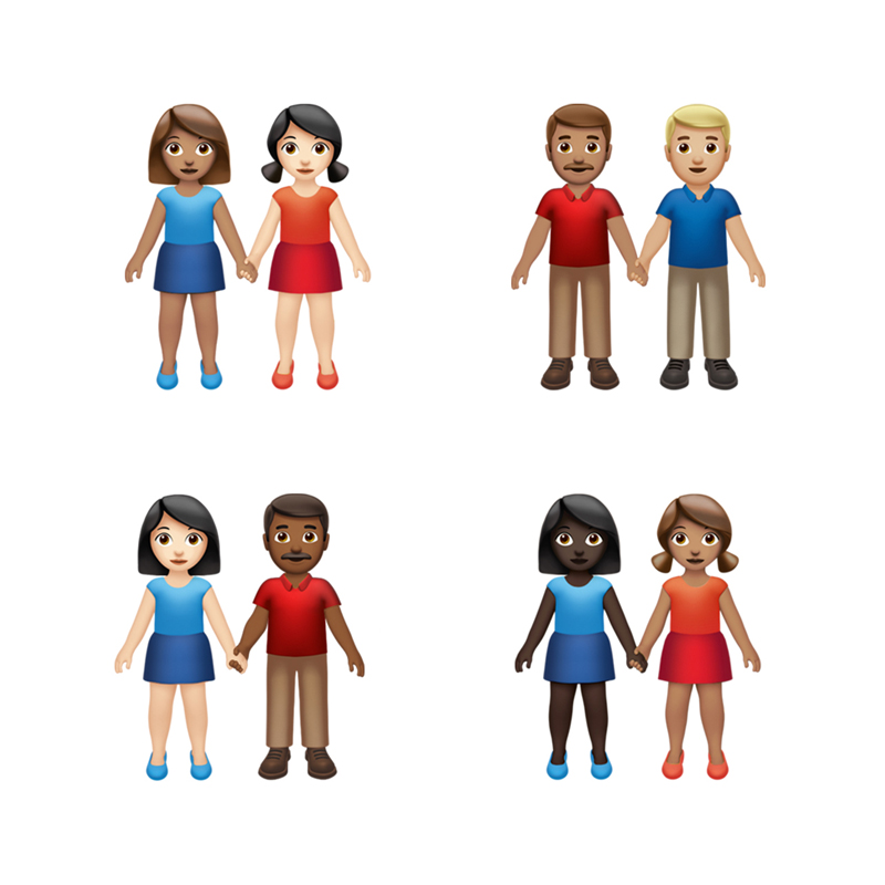 同性カップルの絵文字は現在もありますが、今回はさまざまな肌の色、ジェンダーの組み合わせのカップルが増えました。