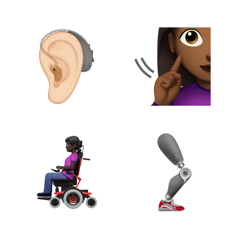 アクセシビリティに対応した絵文字では、車椅子、白杖、義手、義足、私には欠かせない補聴器が追加。