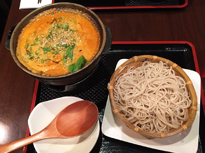 熱々のスパイシー和風スープに浸して食べるつけ蕎麦です。