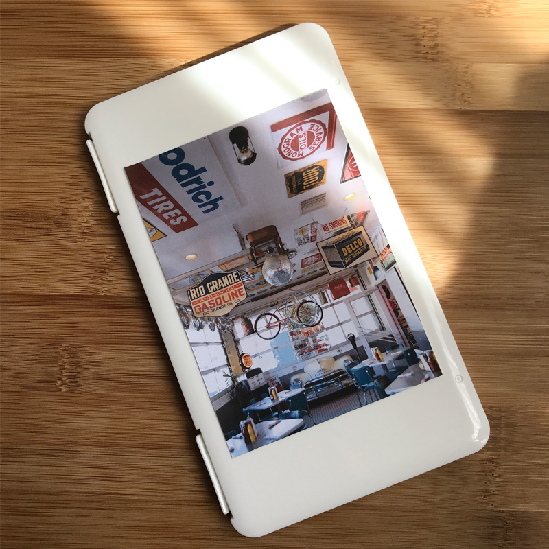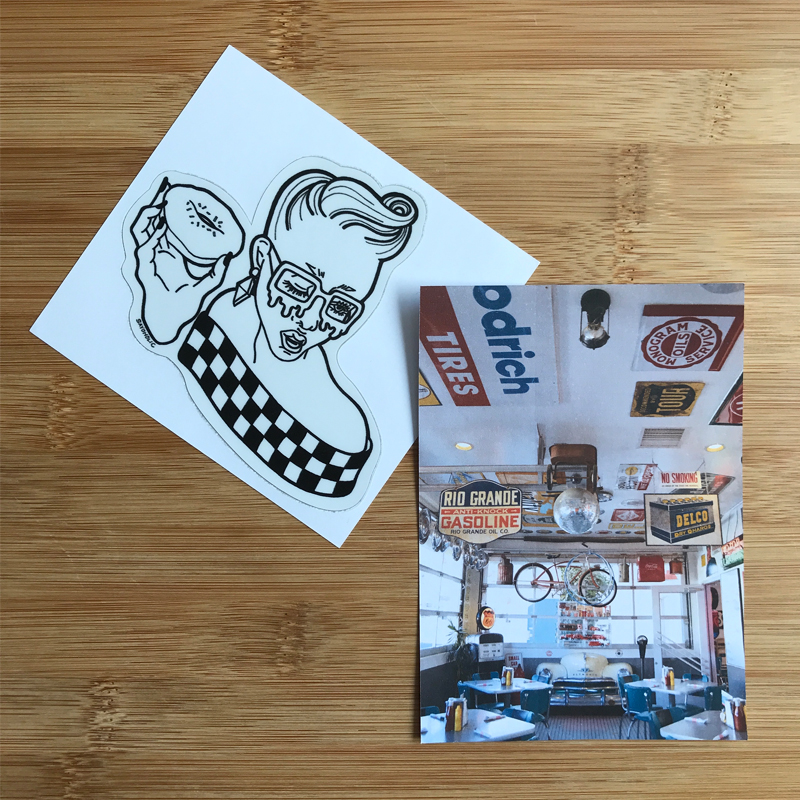 家に使っていなかったシール用紙が余っていたのでお気に入りの写真を印刷して、裏面にも貼りダイナーのイメージにしました。