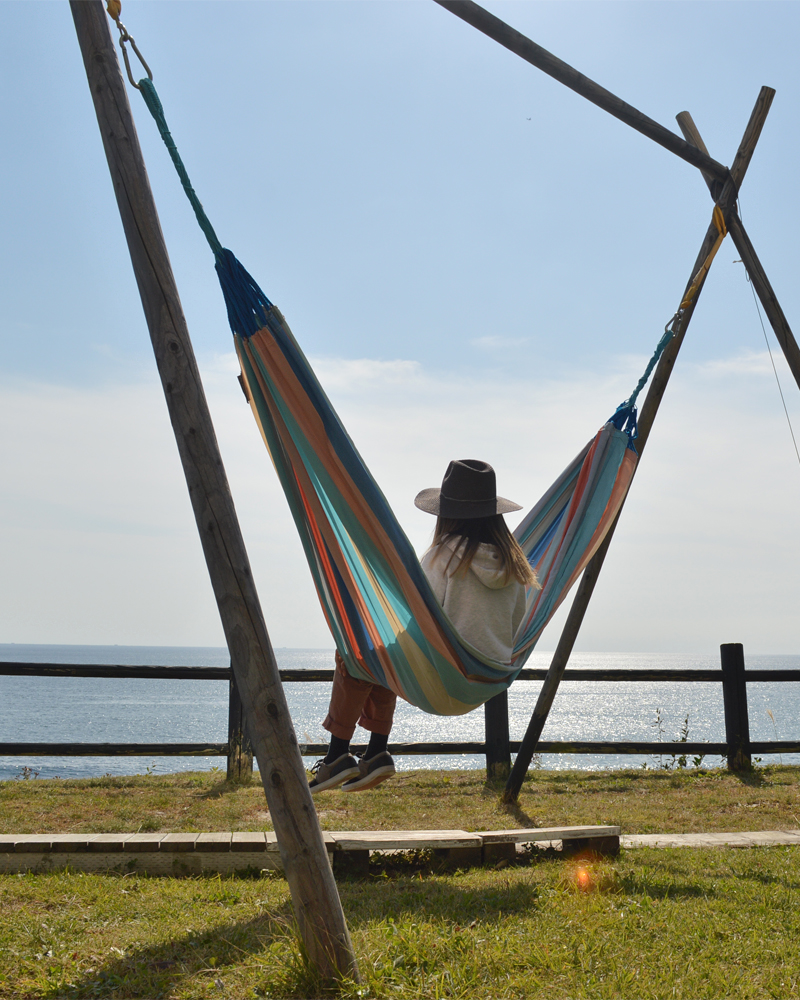 ハンモックやソファと、海をのんびり眺められるインテリアが揃っています。
