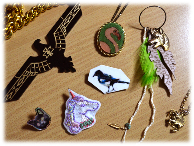 | 左上/ HONEY B.GOLD (USA / Los Angeles) 真ん中上/ カフェで購入したVintageネックレス 右上/ EDGE OF URGE(USA / Wilmington) 真ん中/ 美術館前のマーケットで購入(バッチ本体も鳥も素材は全部、紙!) 左下/ Supreme(USA / New York) 真ん中下/ C’eedle -cadbunny-(札幌在住の刺繍アーティストNahoさん) 右下/ Elizabeth Cole(USA / Los Angeles) |