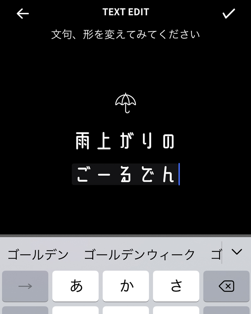 テキスト部分をタップすると、文章を自由に入力することが出来ます。(傘などのアイコンは固定)