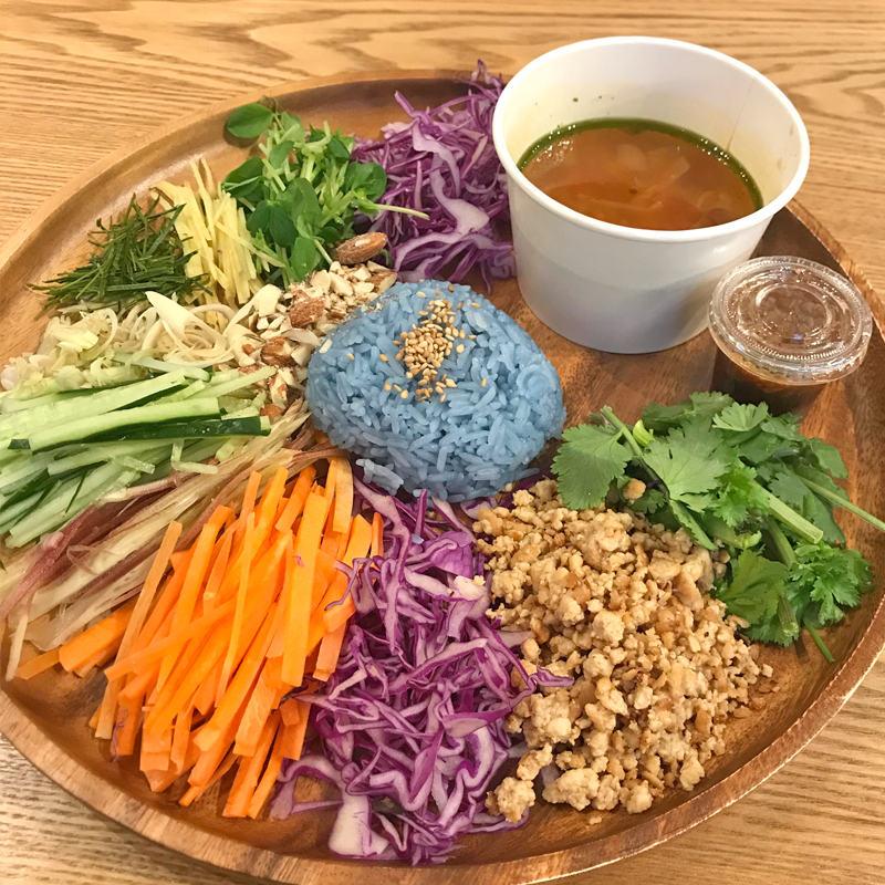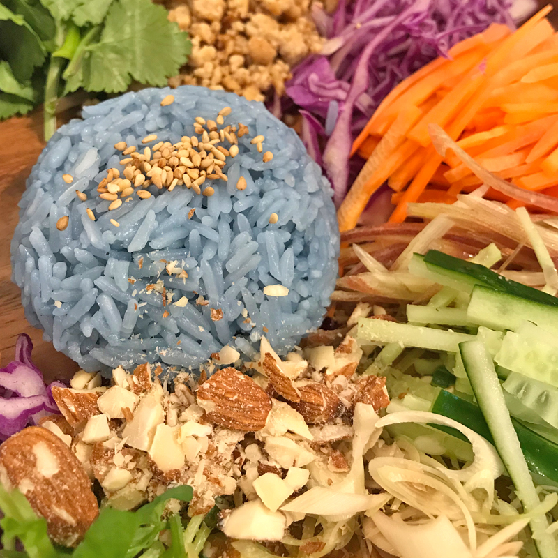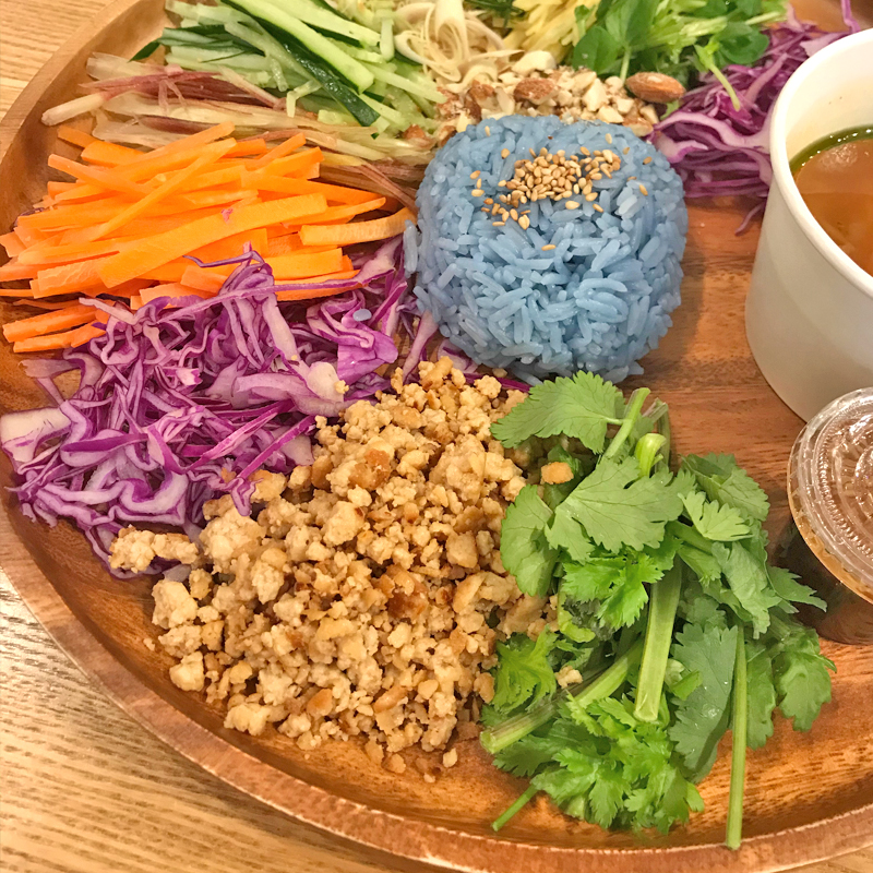 爽やかな色をしたご飯は、バタフライピーという花で色付けたジャスミンライスになります。