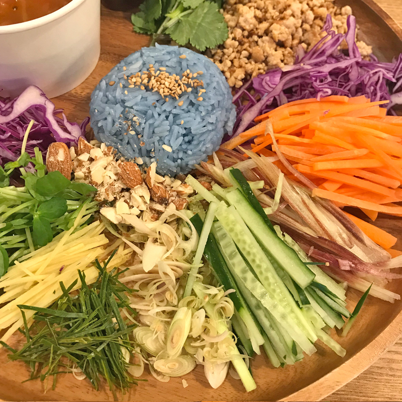 カオヤムを頼むと青い色したご飯が出てくることが多いのですが、最初は見慣れない色に戸惑ったものの今では美味しそうに見えるようになりました。