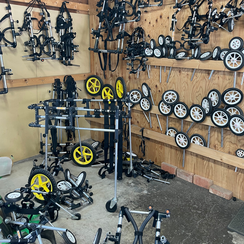 これまでは2輪の車椅子を使っていたのですが、身体の麻痺(変性性脊髄症)が前足まで進行してしまい、4輪に作り替えに行きました。