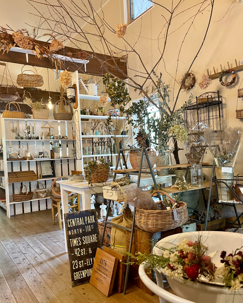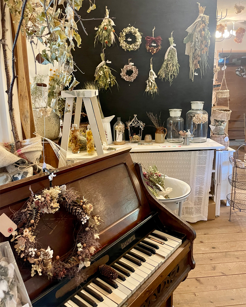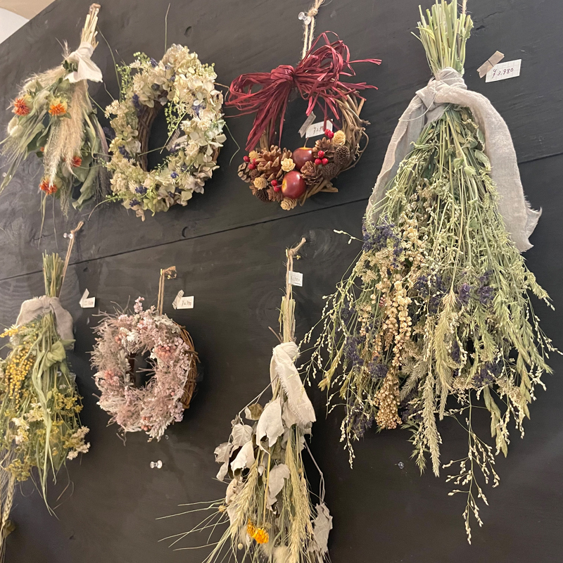 メインはドライフラワー専門店となっており、入り口側には優しい色合いのノスタルジックな1点ものドライフラワーがずらり。