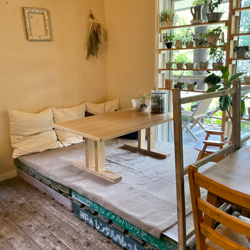 店内の方には、ふかふかのクッションがある小上がりや緑いっぱいの窓際の席があったりと素敵な空間が広がっていました。