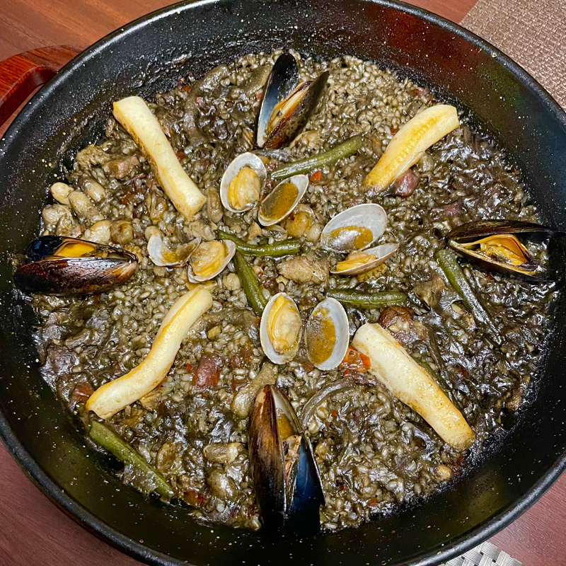 昨夜、訪れた時はパエリアとシュラスコ料理の日で、前もって予約していたイカスミパエリアをいただきました。