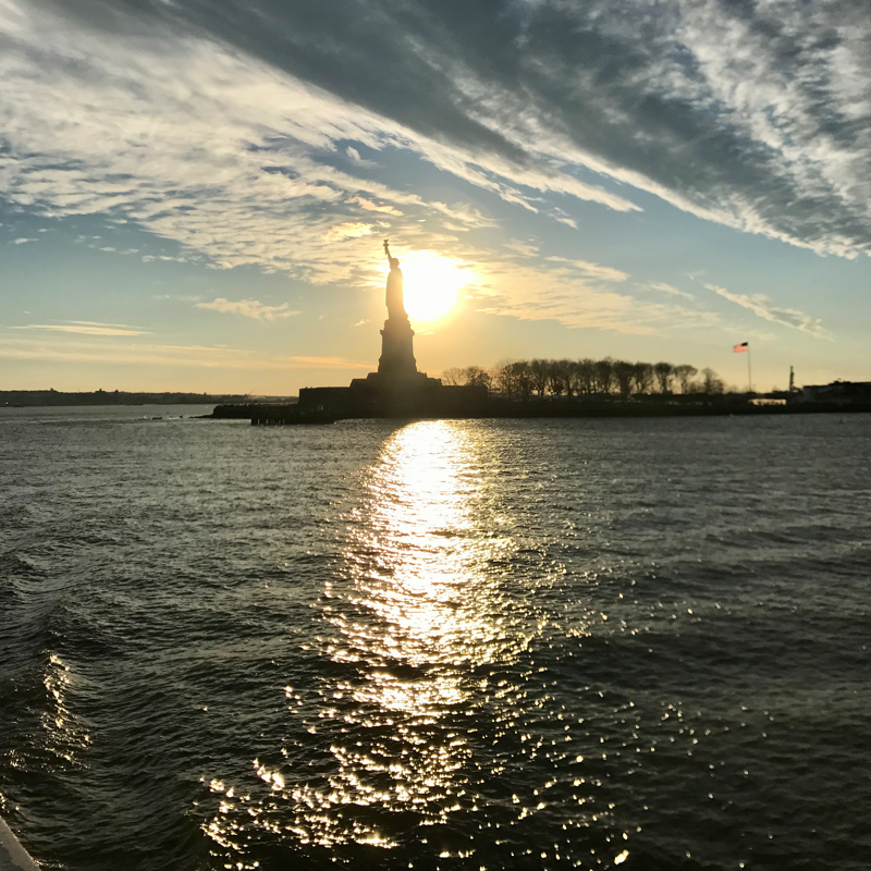 帰りのフェリーはちょうどサンセットの時間帯で、夕陽と自由の女神が重なる瞬間が綺麗でした。