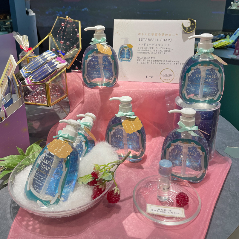 宇宙の香りがするボディソープに、ルピシアとコラボしたオリジナルティーなどお土産にも喜ばれそうなラインナップでした。