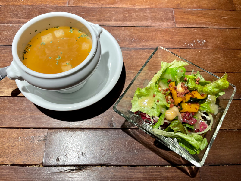 そして、パスタランチにはサラダ・スープ・バケット・ソフトドリンクがセットでついてきます。