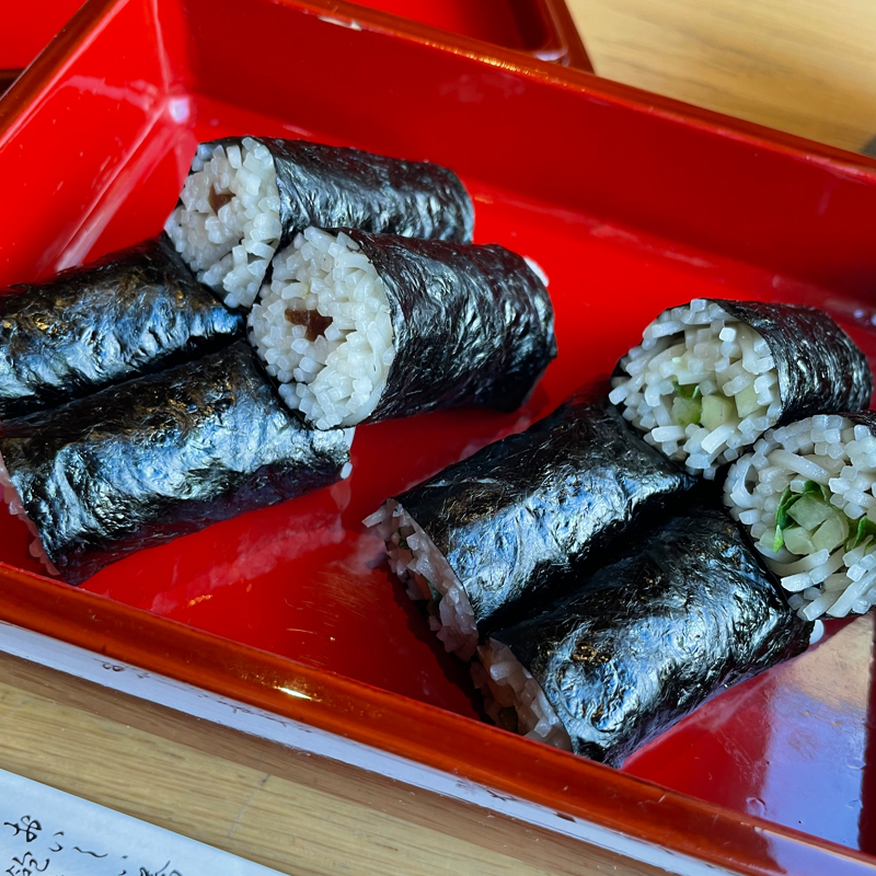 まず、運ばれてきたのは待ちに待ったそば寿司とそばがき汁。