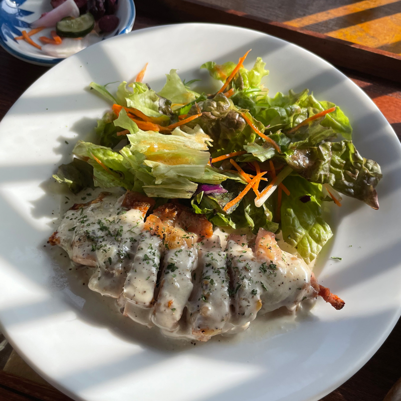 炭焼きの香ばしいチキンと濃厚なアンチョビクリームとの組み合わせがたまりません….