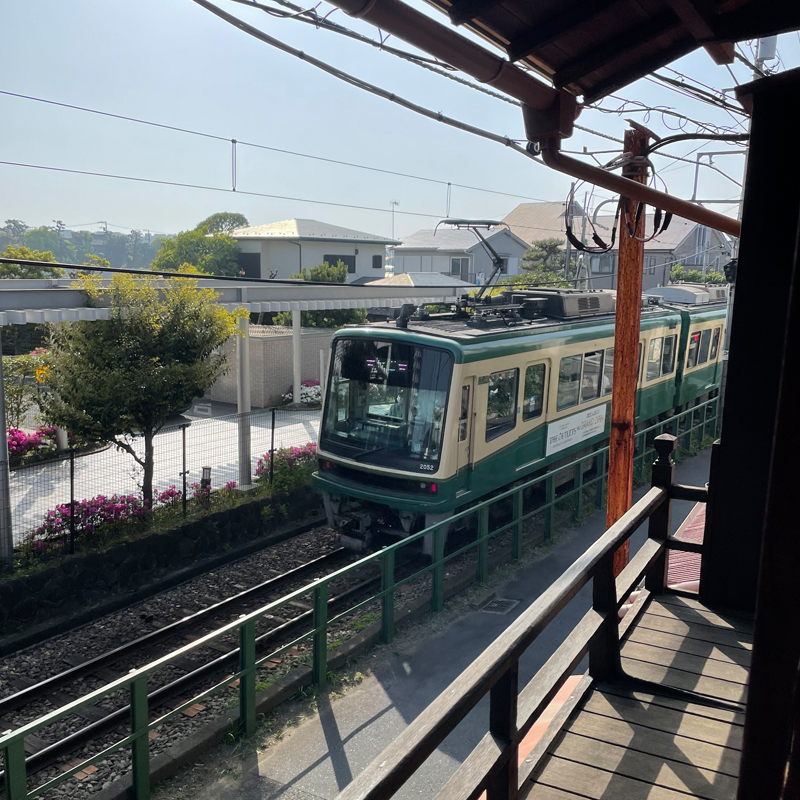 電車の音がする..と思ったら、なんと目の前をさっき乗ったばかりの江ノ電が走っていました。