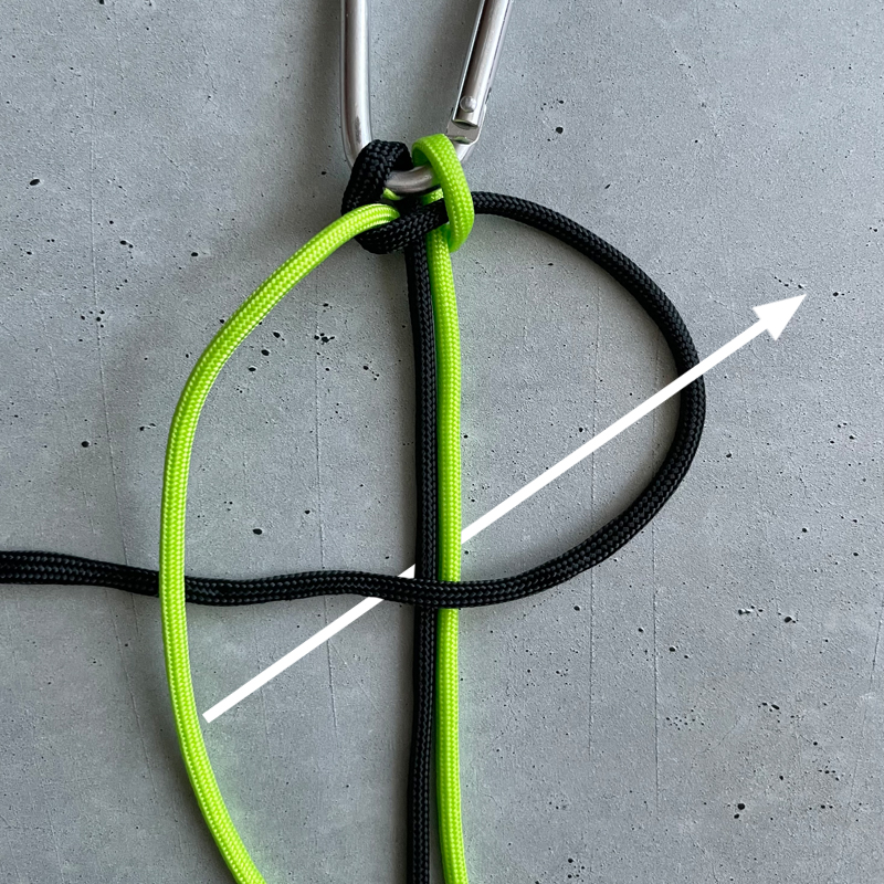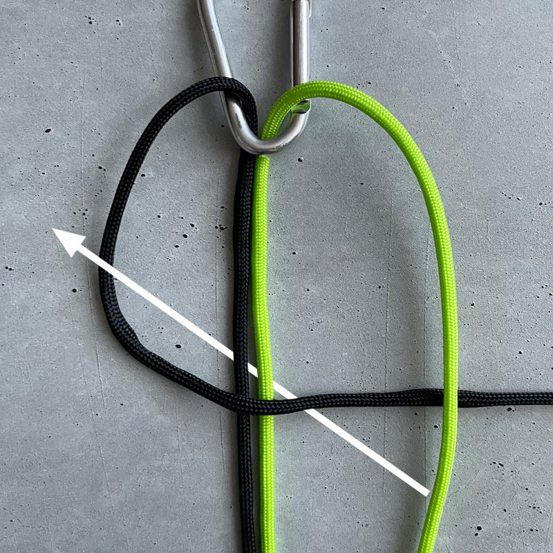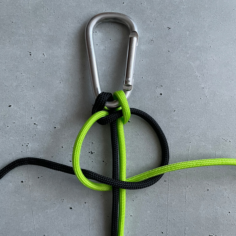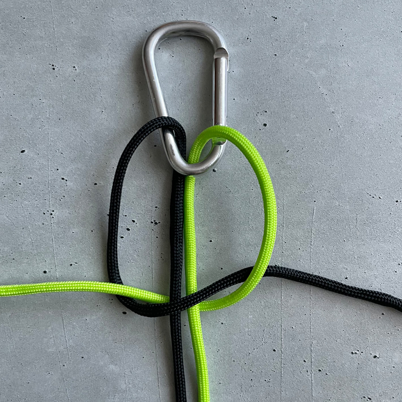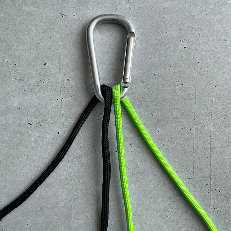 1.パラコード2本をカラビナ等にかけて、ふたつに折ります。真ん中の2本が芯となります。