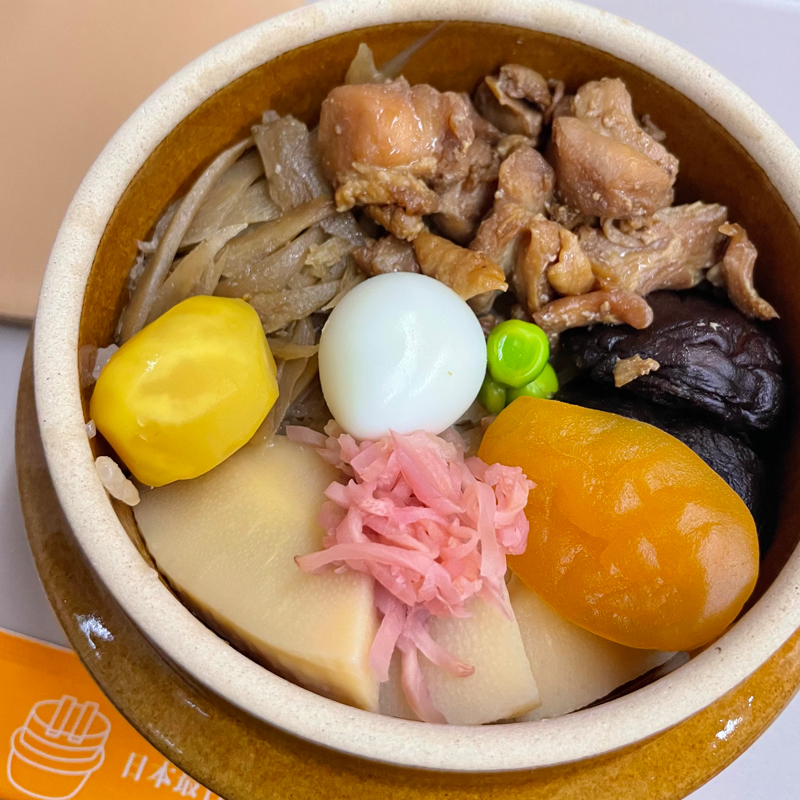 鶏肉に椎茸、あんず、タケノコ、栗、ささがきごぼう..そして、うずらの卵。しかも土釜だからホカホカと暖かい…!