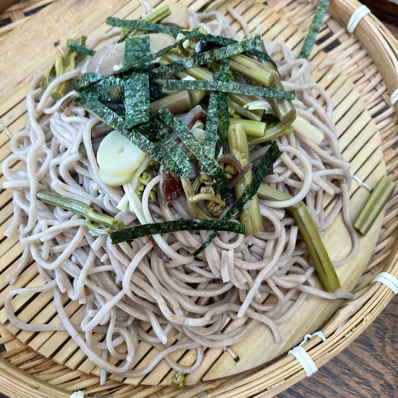 信州産そば粉を使用した碓氷そばは、山菜がのったざるそばを注文。