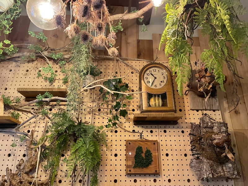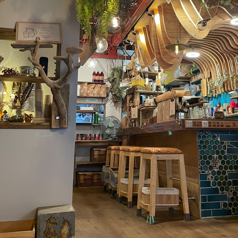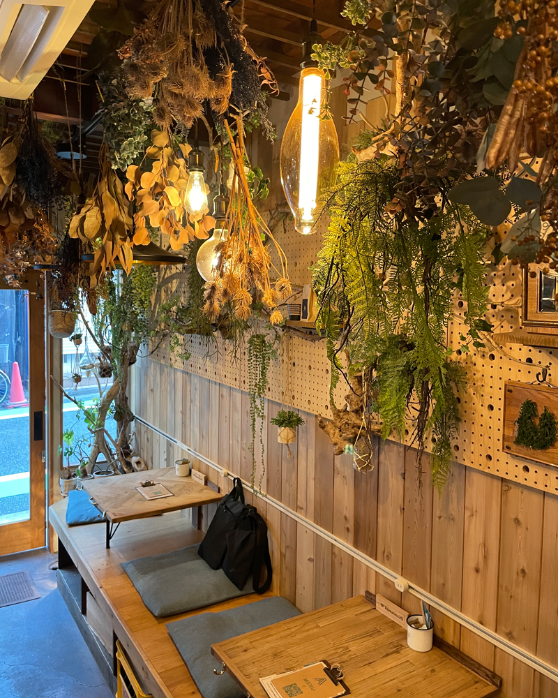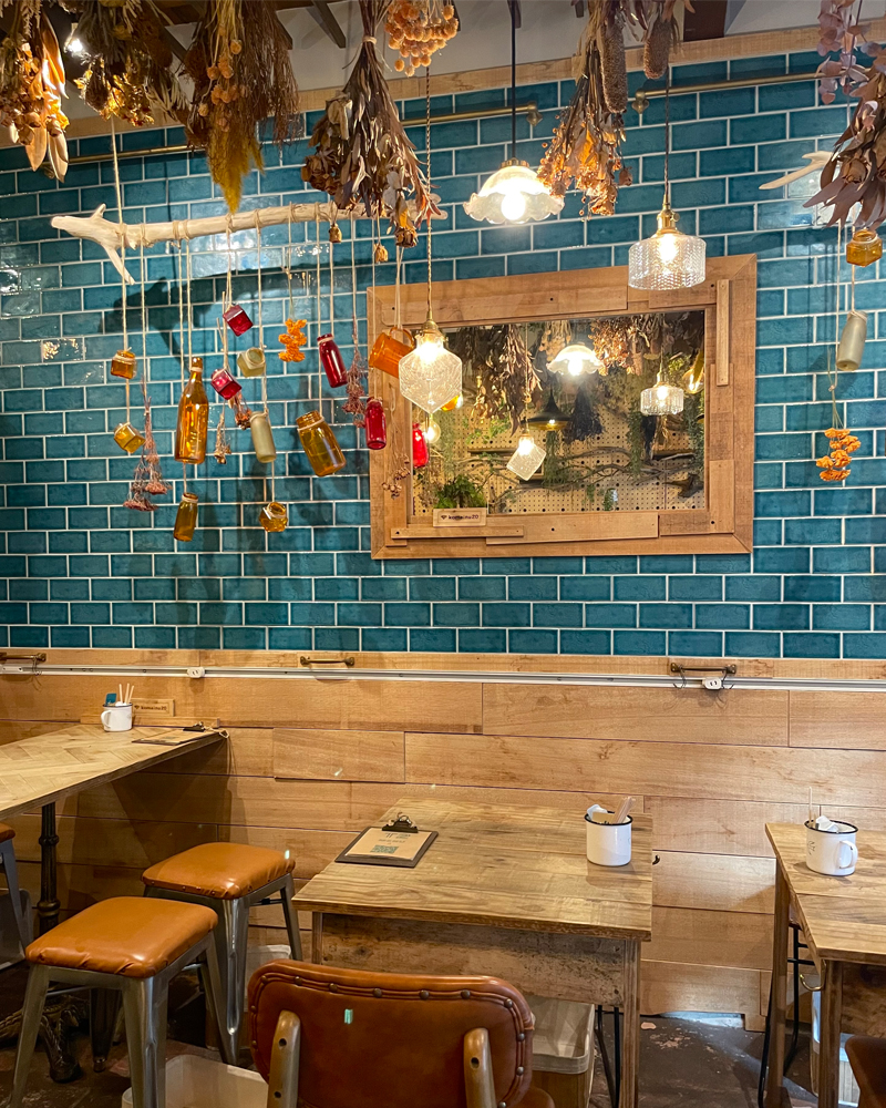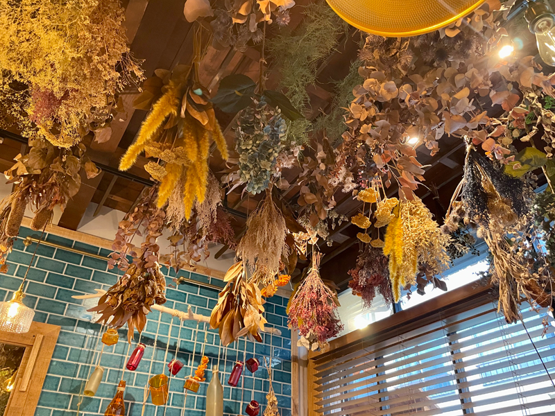 店内は青いタイルにドライフラワーがたくさん吊るされたボタニカルで優しい空間。
