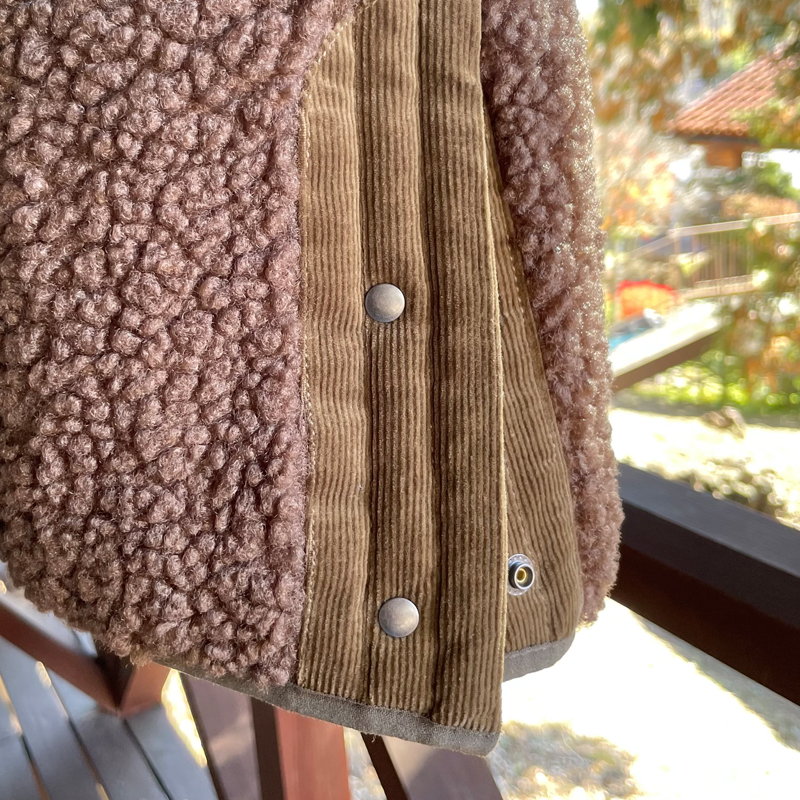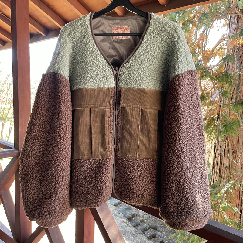 明るめグリーンとブラウンの配色に、コーデュロイの異素材MIXがあまり見かけないデザインですっかり一目惚れ。