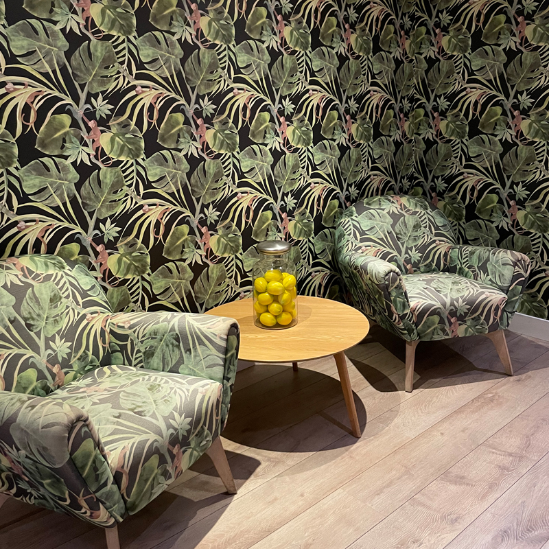 グリーンとイエローの配色でまとめられていて、インテリアもとてもかわいい。