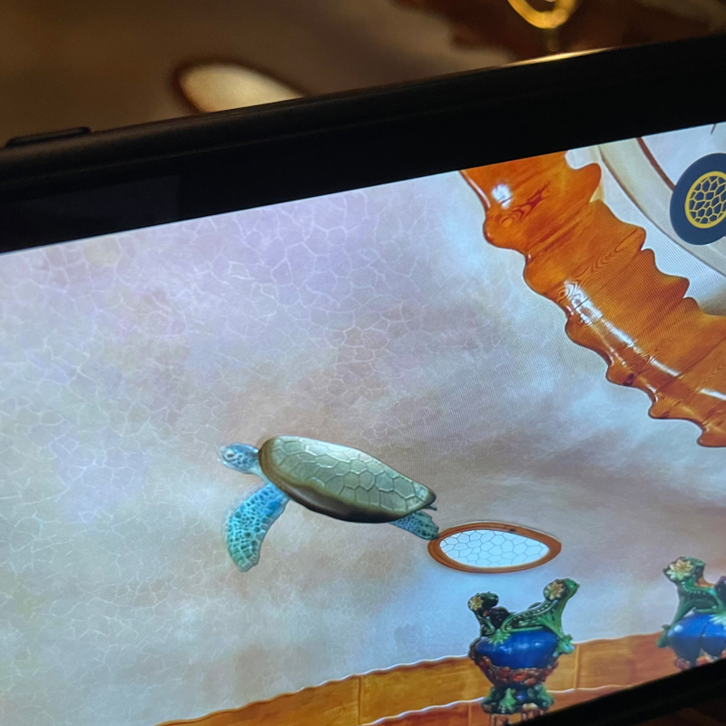 亀の甲羅を思わせる天窓にタブレットをかざしてみると、亀が飛び出し泳ぎはじめたりと楽しい仕掛けがたくさん…!