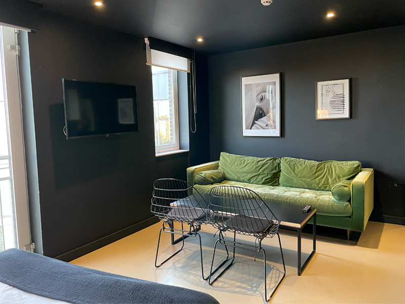 ホテルの壁がブラックというのもめずらしい! かといって暗いわけではなくグリーンも差し色になっていてモードな印象です。