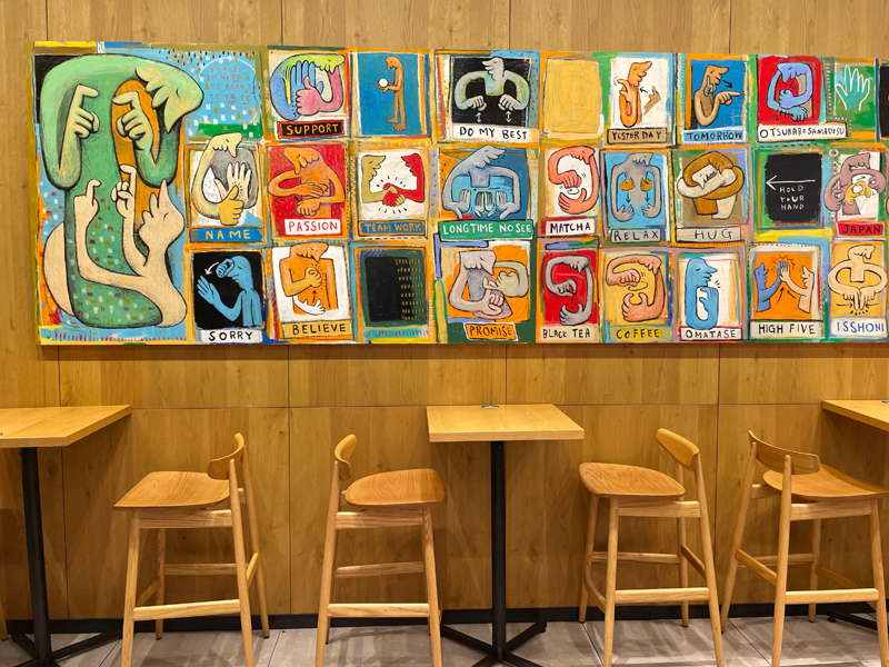 店内に入ると、目についたのが手話を表現した明るい配色のアートの数々。
