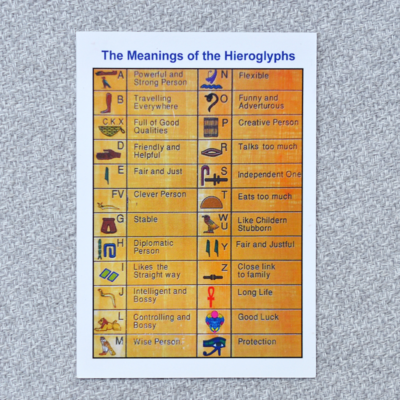 わたしの名前「MAYU」をヒエログリフで入れてもらったのですが、見事に鳥が3匹並んでいて嬉しかったです。(わたしは鳥が好き)