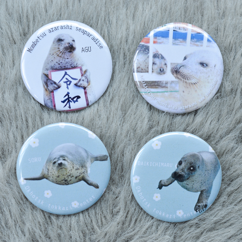 アザラシシーパラダイスにいる、アグくんと日和(ひより)ちゃんのシールと缶バッジ。