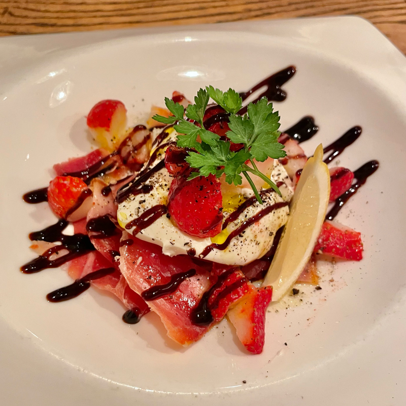 イチゴが乗った生ハム料理だったりと女性が好みそうなメニューが多く、女性のお客さんが多めでした。