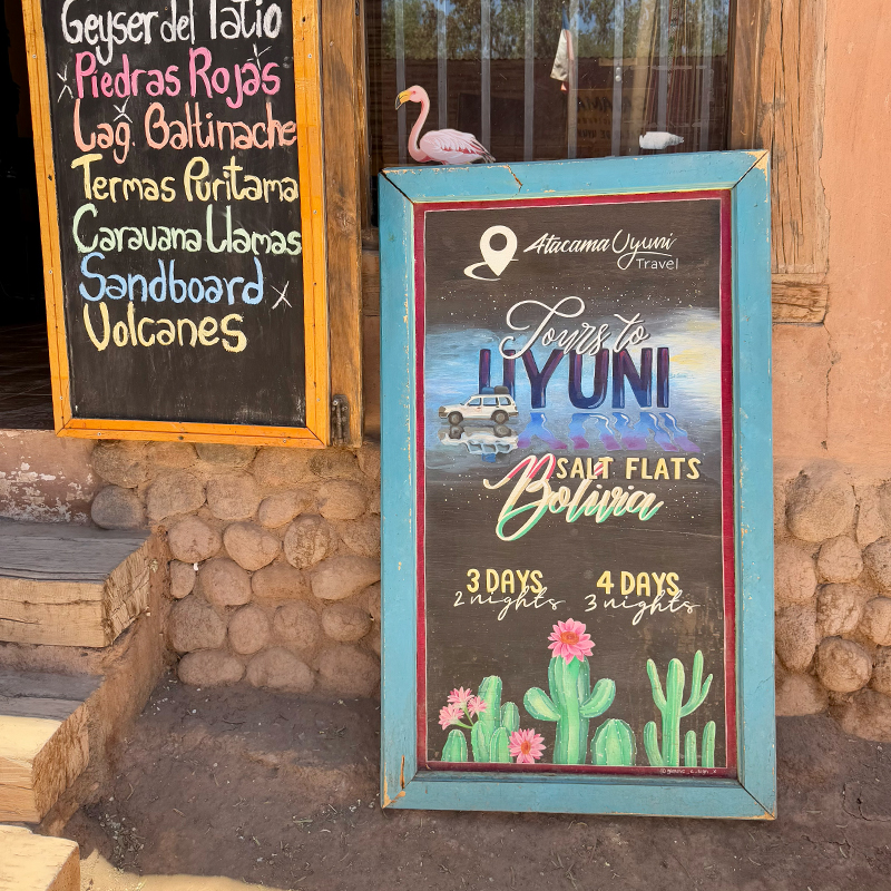 サンペドロ・デ・アタカマはとてもこじんまりとした砂漠の町なのですが、町内を歩くとウユニへのツアー会社がたくさん。(70以上の旅行代理店がある)