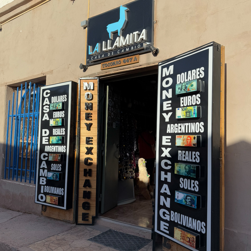 ボリビアへのツアー出発時点ともなっているため、ボリビア通貨であるボリビアーノを用意するべく両替所がたくさん並んでいます。