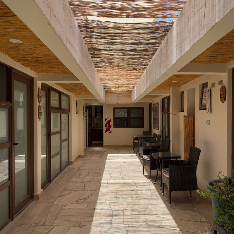 家族経営の小さな宿で、日差しが降りそそぐ中庭がとっても気持ち良い。