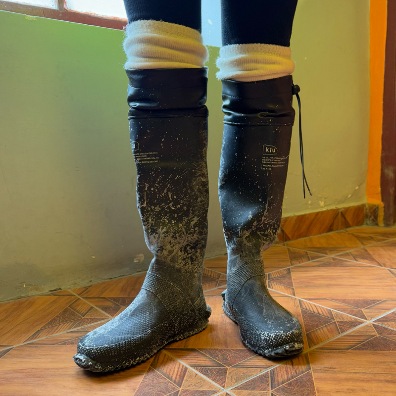 ウユニ塩湖の水はとても冷たく、深いところもあるのでレインブーツは必須!
