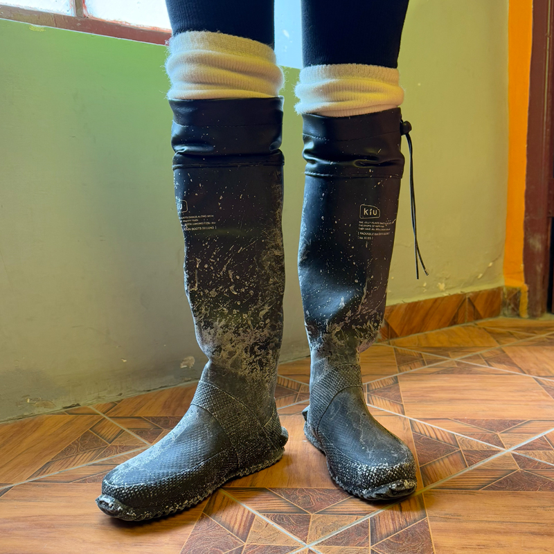 そこでわたしは、レインブーツの中に塩が入り込まないようレッグウォーマーを合わせて使いました。