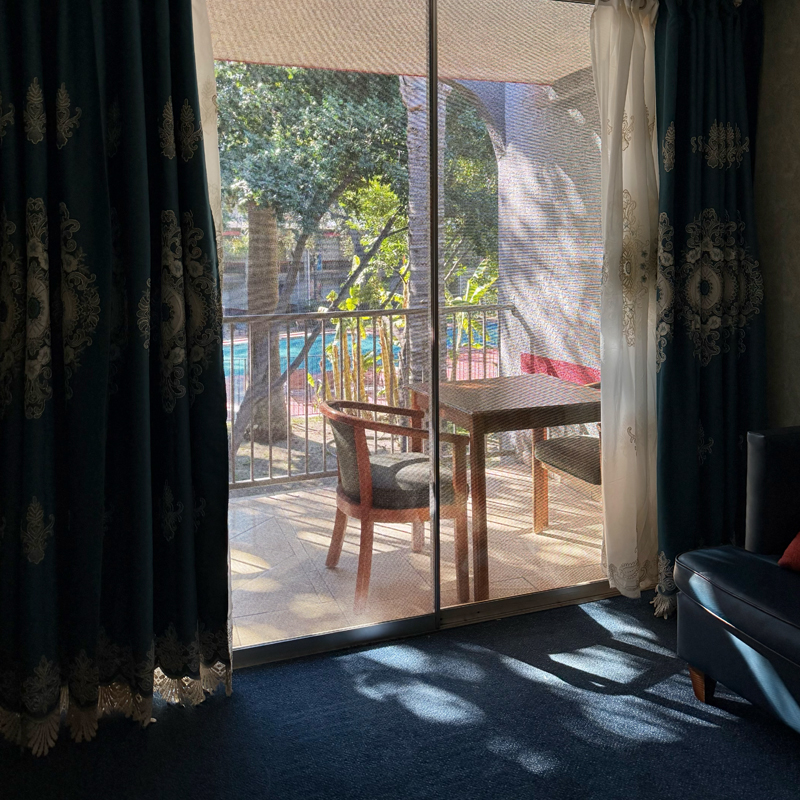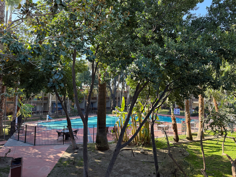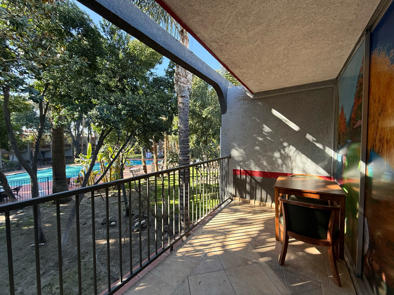 ベランダも思った以上に広くて、向こう側にはプールが見えました。