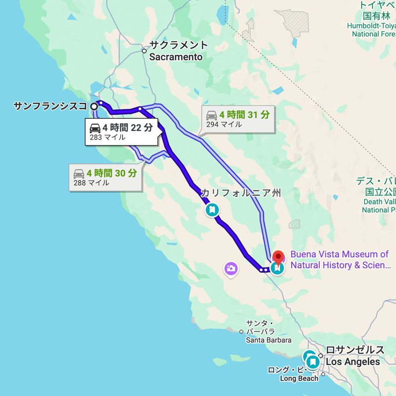 車で向かう場合の所要時間は、約560マイル(約900km)で約9〜10時間。