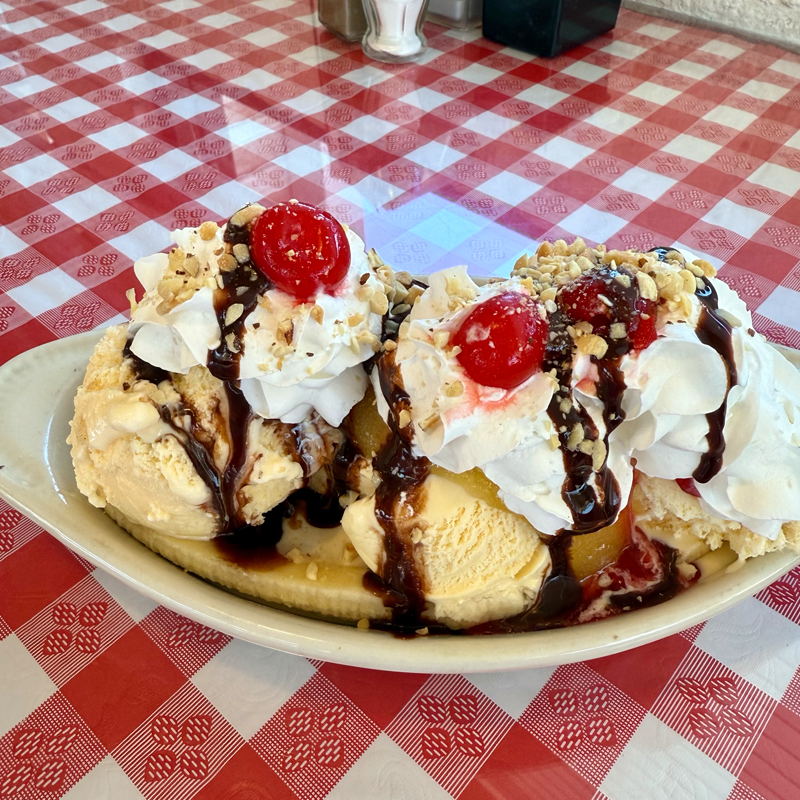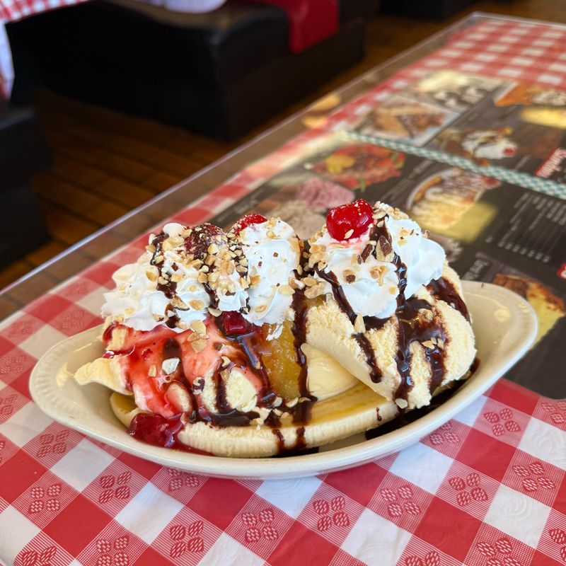 メインはもちろんハンバーガーやフライドポテト…なのですが、午後の微妙な時間でそこまでお腹が空いていなかったので、まさにアメリカ!なバナナスプリットを注文しました。
