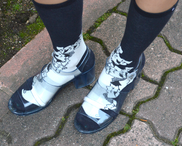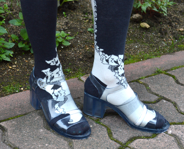 女性の横顔のプリントが生きる様にAmerican Apparelのクリアシューズに合わせました。