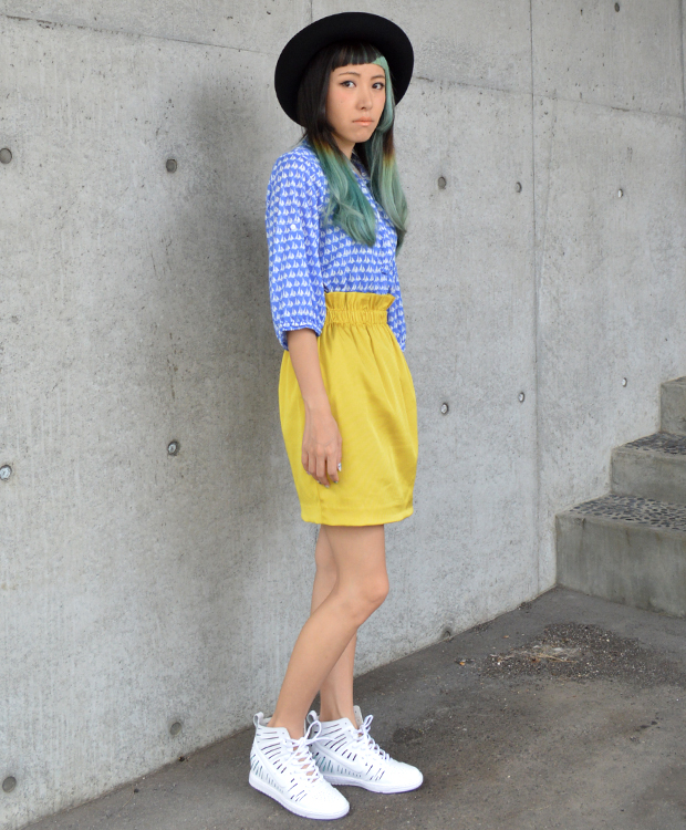 ボトムはブルーと反対色のイエロースカートでコントラストを。