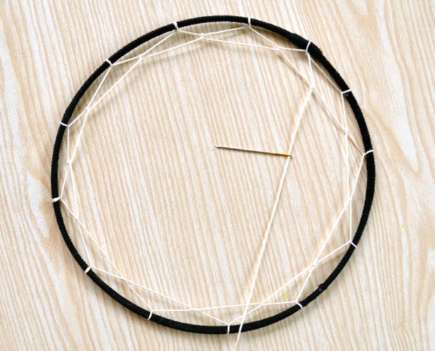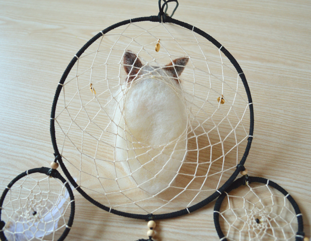 ドリームキャッチャー本体に完成した狼を針と糸で固定します。