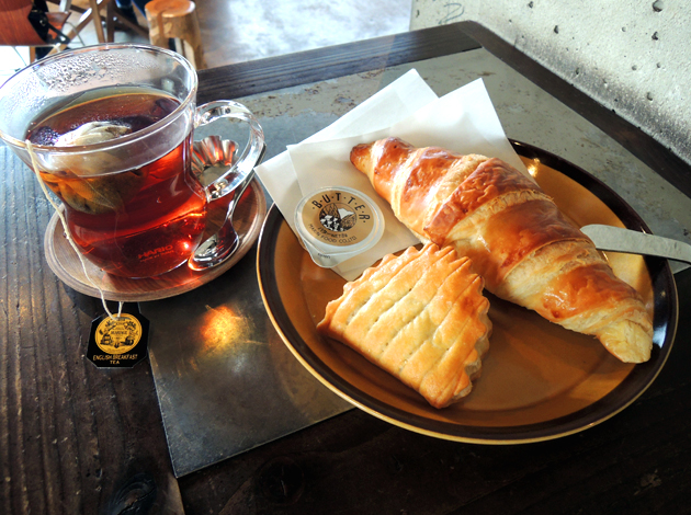 翌朝は焼きたてのパンが並び、クロワッサンとアップルパイを頂いたよ。
