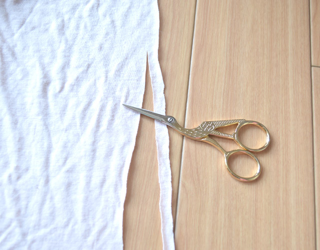 衣類から、飾り付けのフリンジ部分用に生地を細長く切り取り