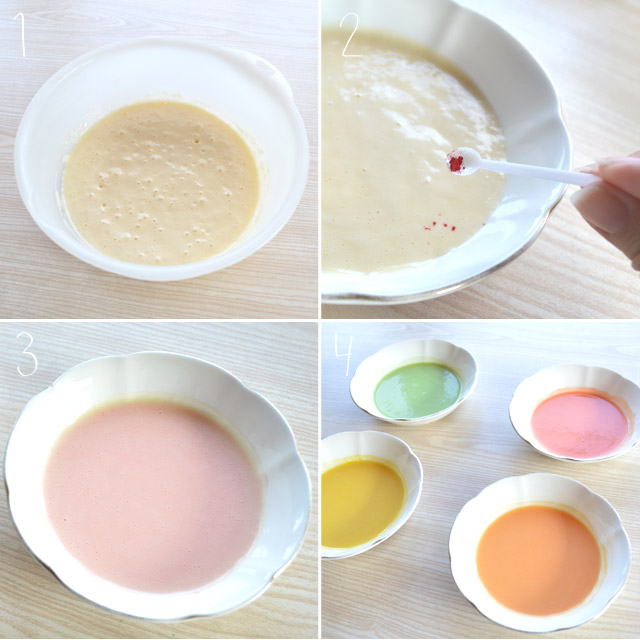 赤と黄色と青の3つの食紅があれば、レインボーカラーが全部作れるよ♪