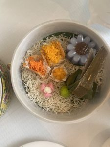タイの茶菓子みたいなのもついてきたのですが、お花の形をした羊羹みたいなのがかわいかった